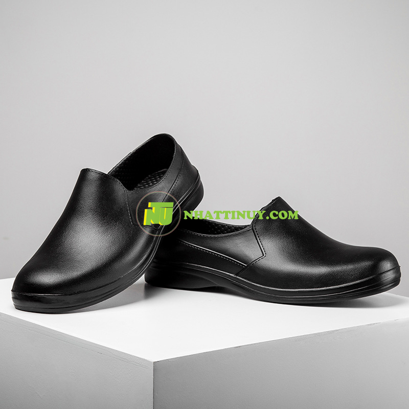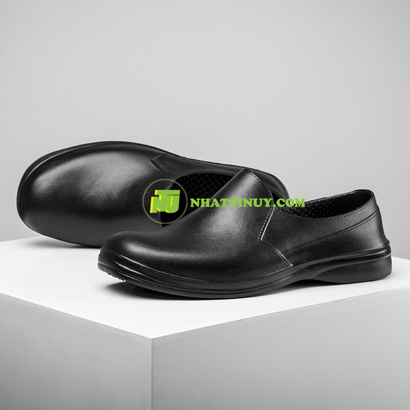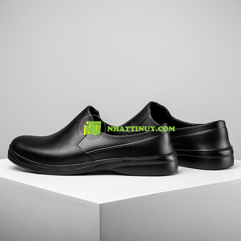 - Trên bên mặt giày thiết kế nhẵn thiết kế dạng bít chống thấm nước phù hợp cho nhân viên bếp.